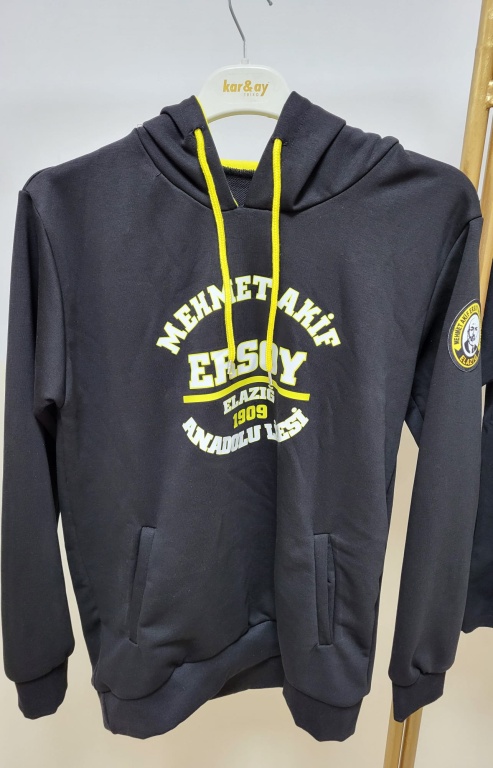 Hırka, düz siyah yakalı veya kapşonlu sweartshirt üzerinde üstünde herhangi bir marka amblemi olmayacak ve okul amblemi dikili veya baskılı biçimde olacak. (Örnekteki kapşonlu sweartshirt olması zorunluluğu bulunmamaktadır. Düz siyah kapşonlu sweartshirt üstüne okul ambleminin baskı yerinde olduğu gibi göğüs ortasında dikili olması yeterlidir. Mont fermuarı açık olduğunda okul arması görünür olmalıdır. İstenirse örnekteki kapşonlu sweartshirt alınabilir.)
